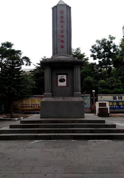 林文英烈士系文昌县清澜镇人,是孙中山先生的好友,也是著名的爱国华侨。清宣统元年(1909年)林文英奉孙中山之命,组织同盟会海口支部,创办琼崖最早的革命报刊《琼岛日报》,宣传孙中山的爱国思想和民权主张。宣统三年(1911年)10月10日,辛亥革命成功将清王朝推翻,成立了中华民国,林文英被推选为国会议员。民国三年(1914年)3月29日,林文英因组织“讨袁运动”而被袁世凯的爪牙陈世华、陈子凯逮捕杀害于府城第一公园(今区工人文化宫所在地)。民国8年(1919年),孙中山亲笔为林文英烈士墓碑提文,曰:“烈士林文英之墓”,署名“孙文敬题”。为纪念革命烈士,各界人士纷纷捐款建造了烈士纪念碑和纪念亭。