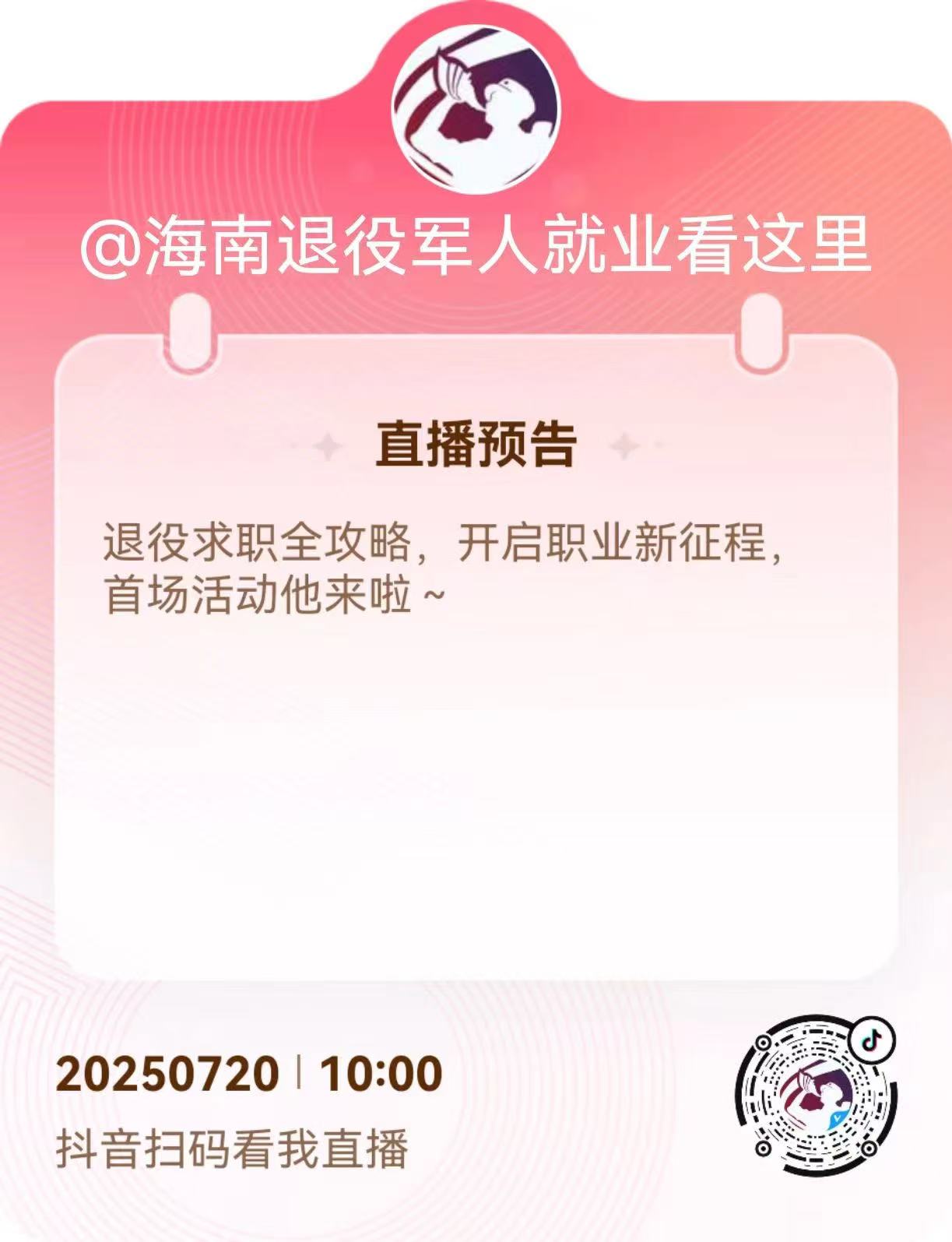 聚焦海南省退役军人职业能力转化、本地化岗位对接和可持续就业支持,结合政策优势与海南产业特色,将直播工具转化为退役军人就业服务新基建,助力海南打造“退役军人高质量就业示范区”,在海南省退役军人服务中心指导下,由海口市龙华区人力资源和社会保障局(区劳动就业和社会保障管理中心)、海口市龙华区退役军人事务局主办,海南长信人力资源有限公司、海南就业驿站-海口大同街道站和海南就业驿站-海口盐灶大社区站承办的“退役求职全攻略,开启职业新征程”退役军人求职启航站——就业启蒙专场将于7月20日举行,并于7月20日进行线上直播带岗。